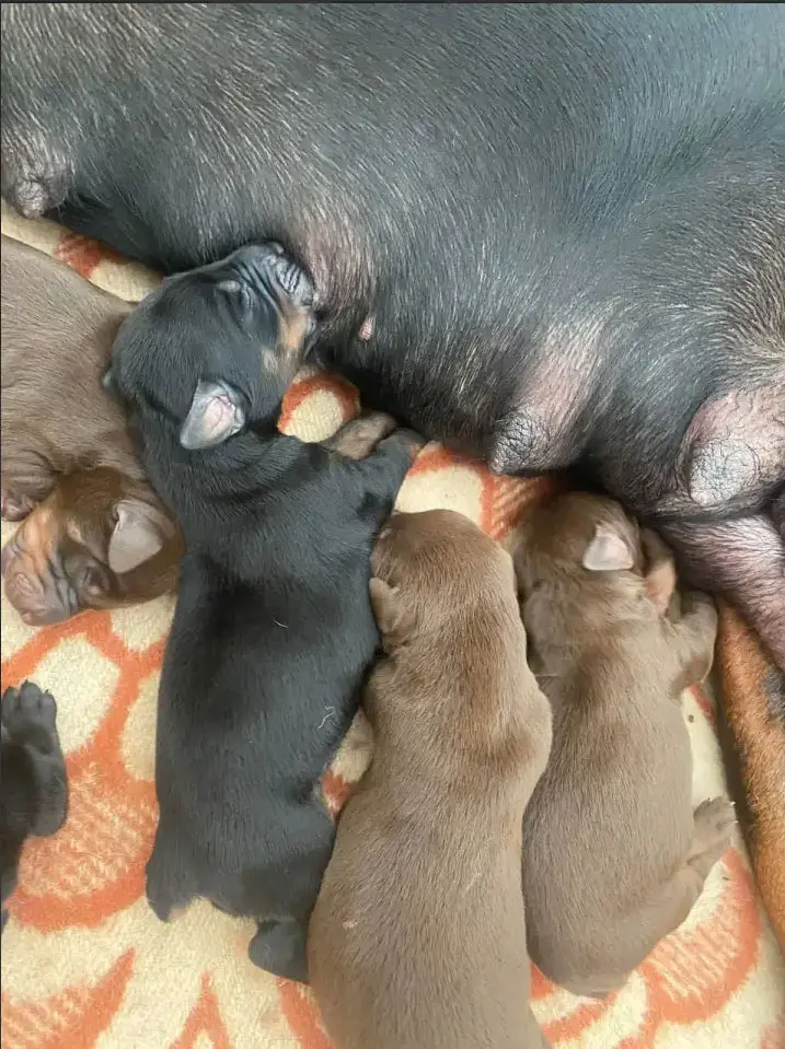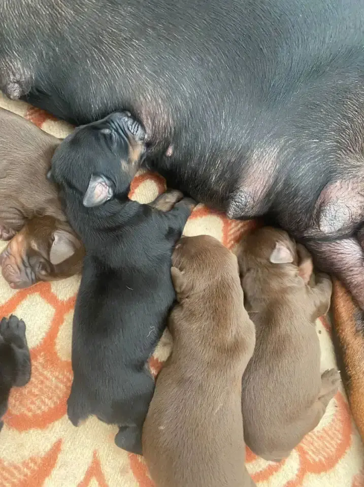 16 сентября 2025 года у нас родились замечательные щенки - 6 девочек и 6 мальчиков с чёрным и коричневым подпалом. Это второй помёт от пары, которая живёт вместе. Хвостики купированы, ушки - по желанию нового владельца. Документов нет, но щенки здоровые и активные, готовы к переезду в заботливые руки.
